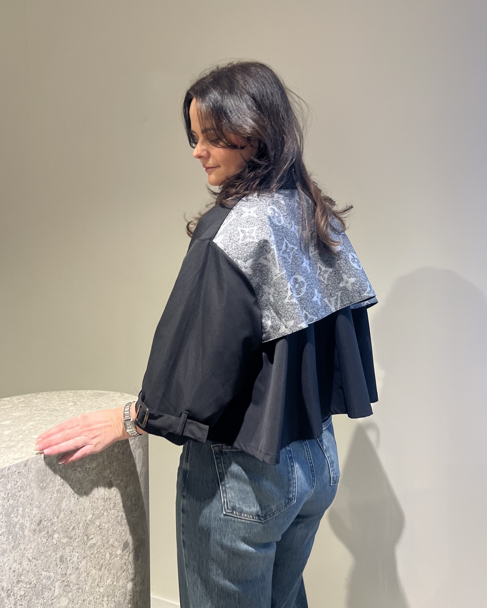 Deze opvallende trenchcoat met capevorm en driekwart mouwen van Attire Amsterdam is een écht statement pieces: handgemaakt in Nederland, met oog voor detail, duurzaamheid en stijl. Elk kledingstuk is uniek — van elke blazer bestaat er letterlijk maar één. Geen massaproductie, geen kopieën. Alleen handwerk, creativiteit en kwaliteit. Dit jasje is gemaakt van leftover designer stof van Louis Vuitton. One size en op verschillende manieren te dragen en stylen. De trend van dit moment.
