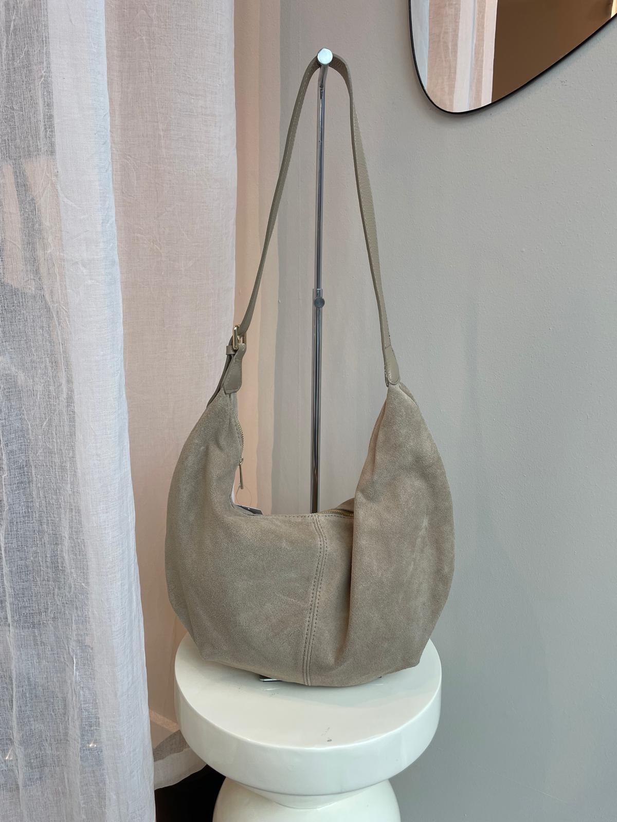 De tas is gemaakt van suede met een fijne soepele touch. De schouderband is te verstellen met een riempje en het grote vak is af te sluiten met een rits. in de tas vind je een steek- en ritsvakje voor kleine items.