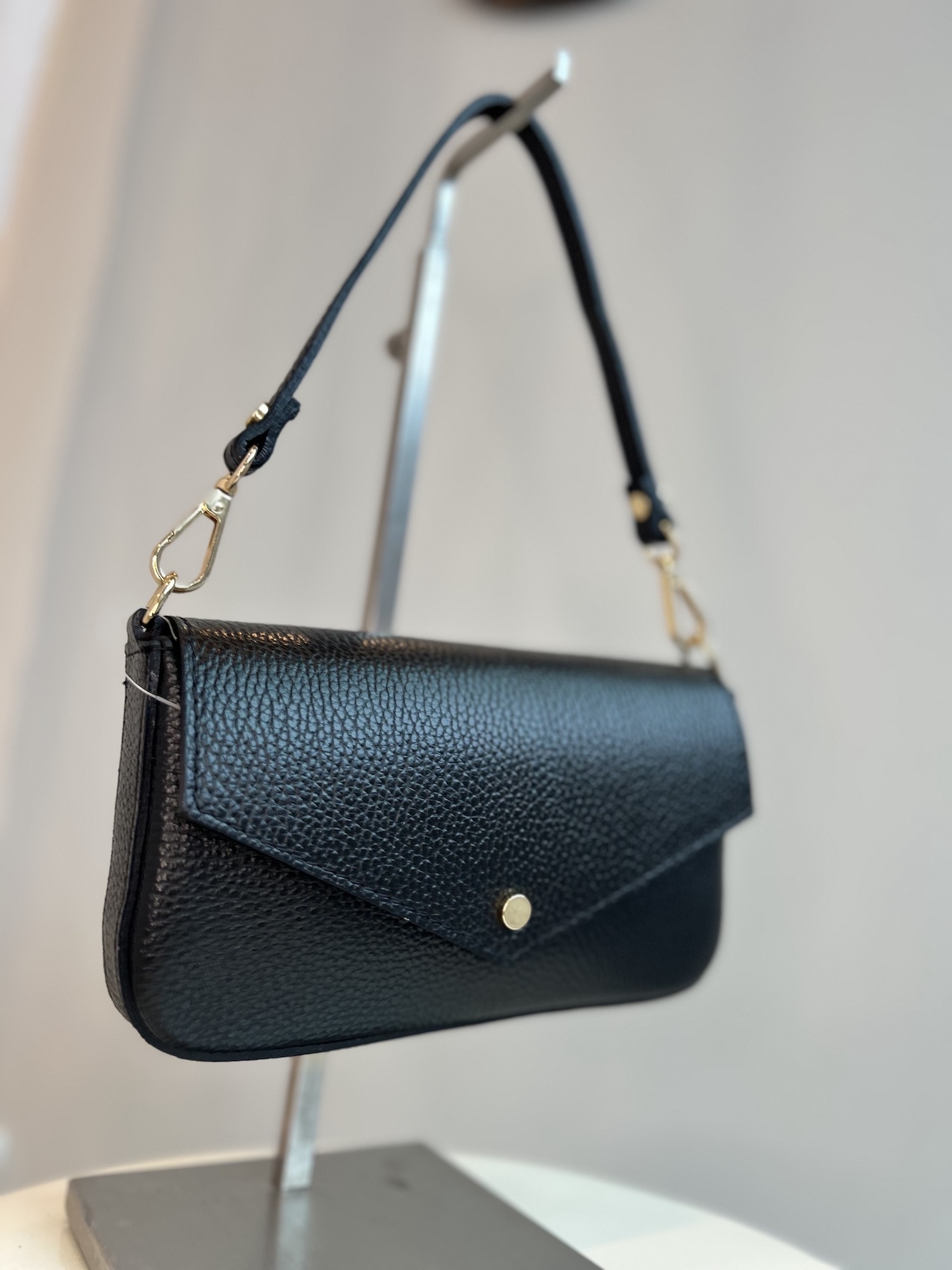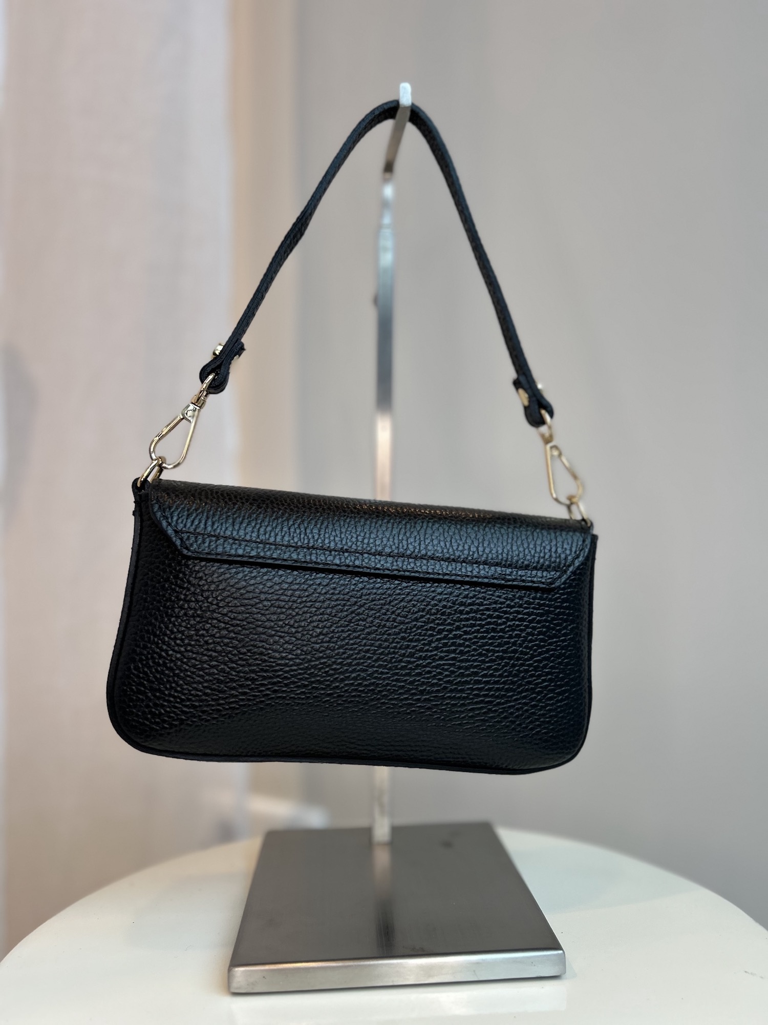 Het tasje is gemaakt van echt leer en heeft gouden details. De tas sluit middels een magneetsluiting en bevat een korte & lange leren schouderband.