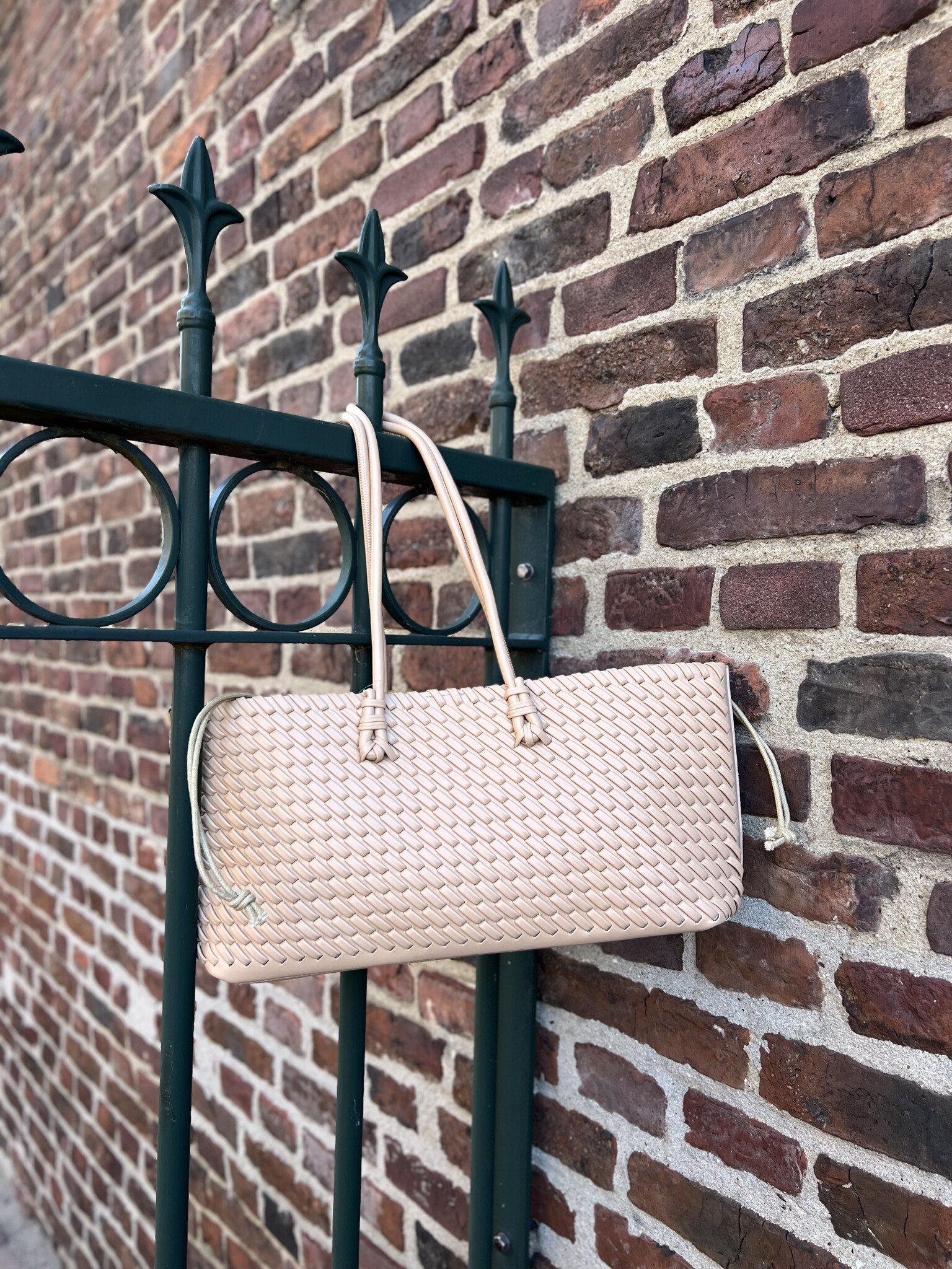De schoudertas sluit met een trekkoordje aan beide kanten.