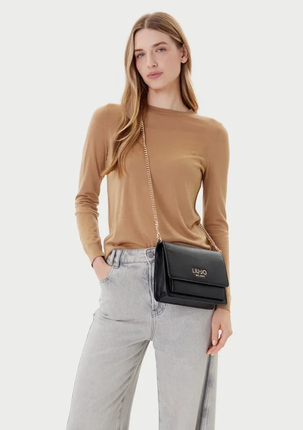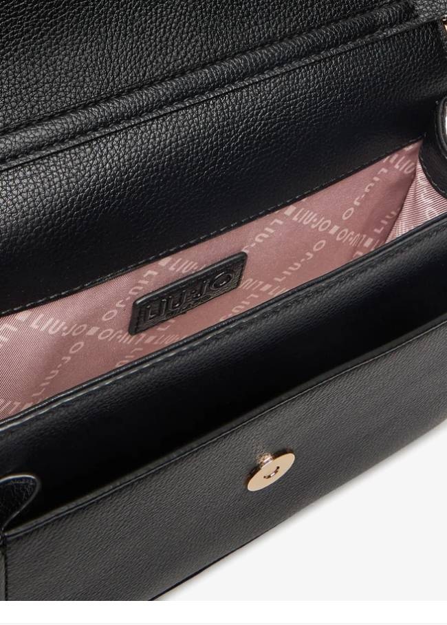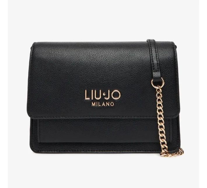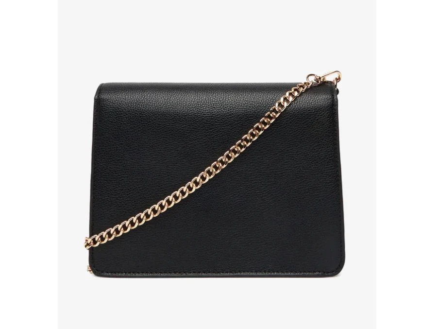 Compact zwart schoudertasje met gouden ketting. De tas sluit met een magneet.