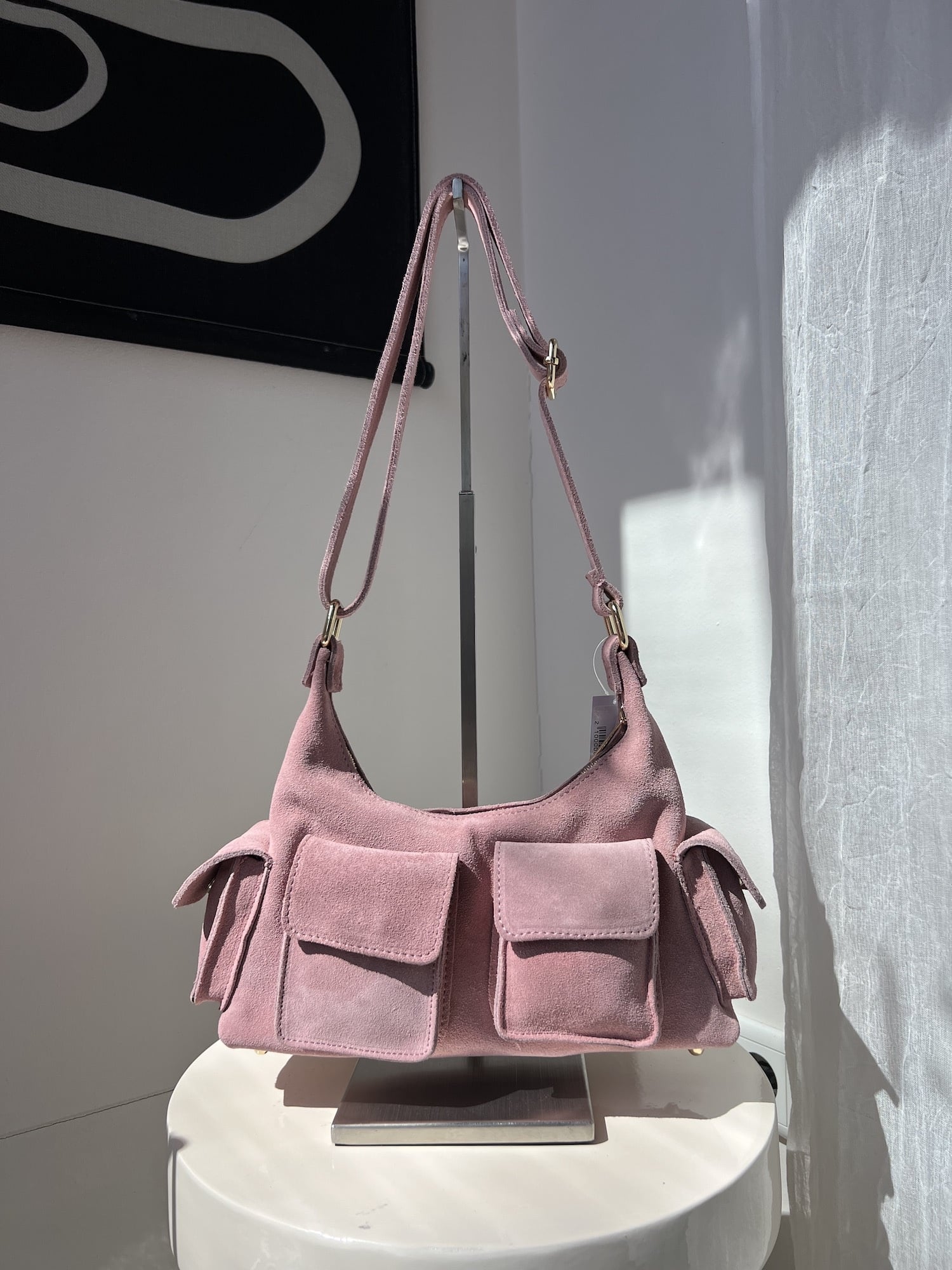 Stoere, suede schoudertas met veel vakjes. De schouderband is in lengte verstelbaar. De Nina suede schoudertas roze heeft een ritssluiting.