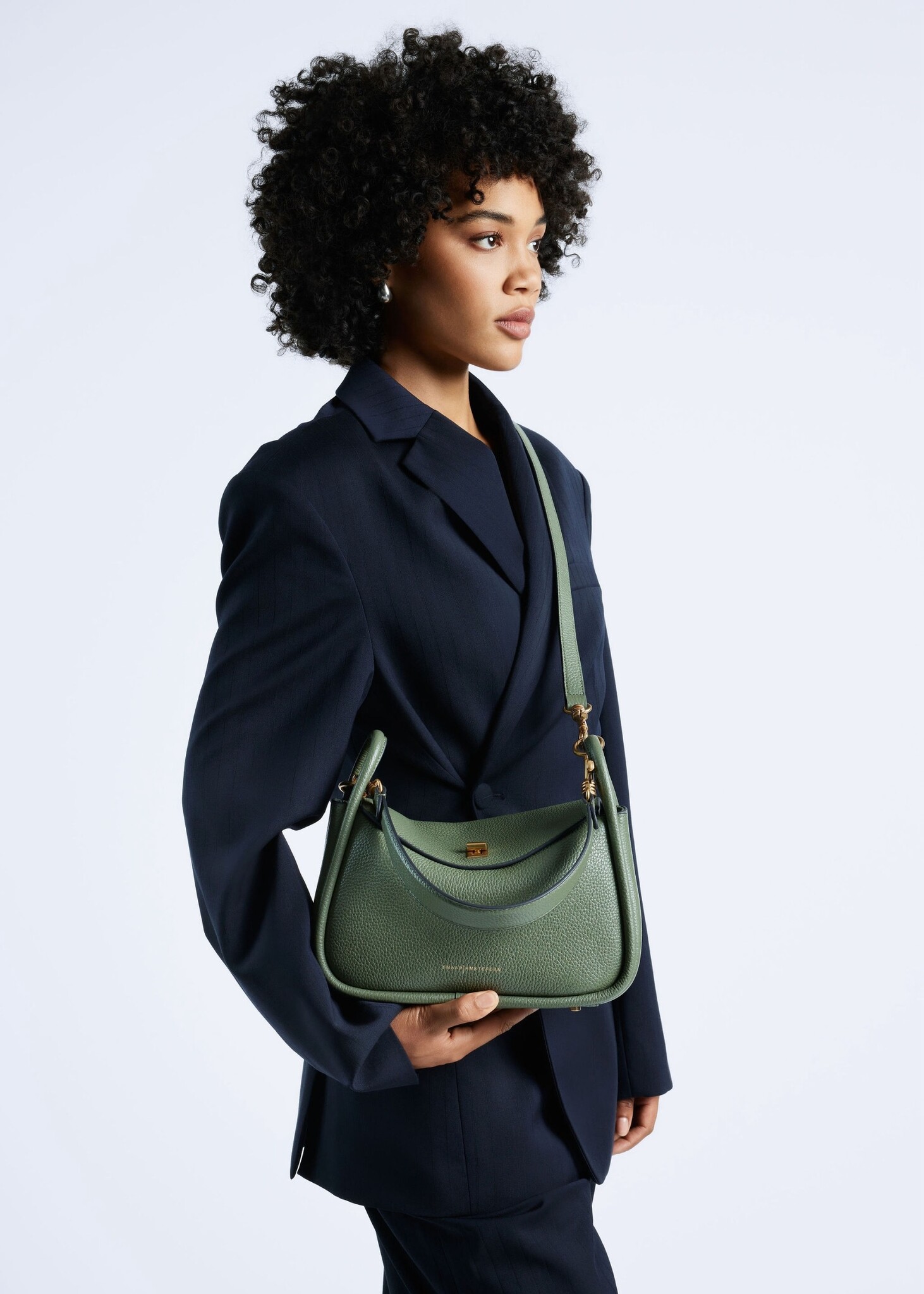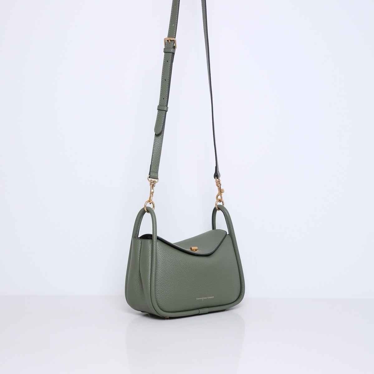 Uniek aan het design is de leren afwerking van de hengsels wat doorloopt aan de voor- en achterkant van de tas. Je kunt het korte handvat eraan bevestigen om als schoudertas te dragen of het lange hengsel om deze crossbody te kunnen dragen. De tas gaat open aan de bovenkant gesloten met een elegante externe schuifsluiting.