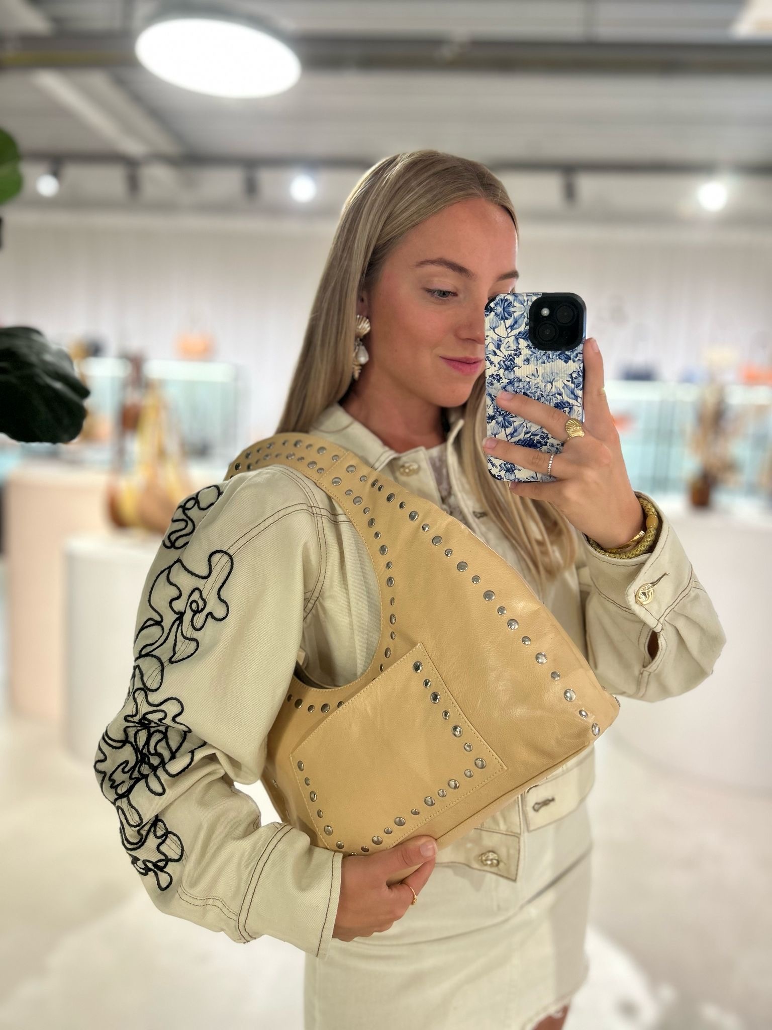Wordt een van deze tassen jouw nieuwe favoriete statement piece? Deze tassen zijn niet bang om op te vallen – met een patroon van speelse zilveren studs is ze stoer, stijlvol én verrassend veelzijdig.