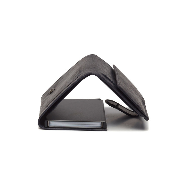 Stijlvolle en veilige pasjeshouder met RFID bescherming en gemaakt van hoogwaardig massief aluminium. Deze pasjeshouder is voorzien van een leren hoes met drukknoopsluiting waarin je zowel pasjes als briefgeld kunt bewaren.
