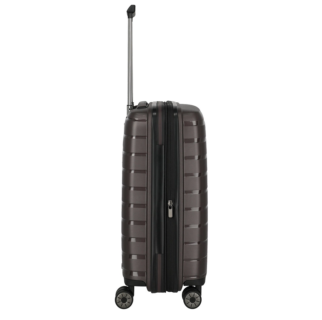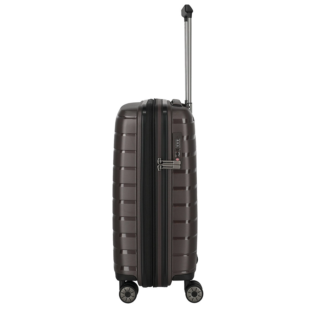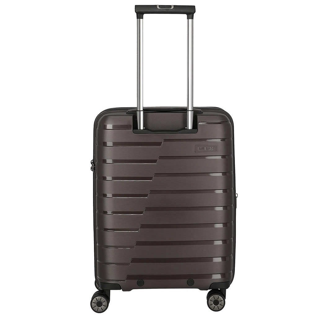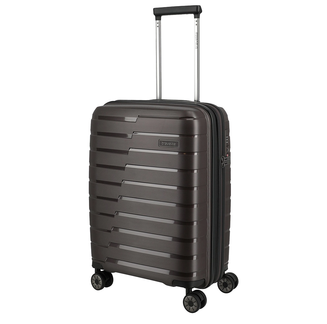 Handbagage maat koffer uit de Air Base serie van Travelite. Travelite brengt met de Air Base collectie een moderne serie die zich kenmerkt door het soepele polypropyleen materiaal in drie luxe metallic kleuren. Het interieur is voorzien van een hoogwaardige voering en van elastische inpakriemen en heeft twee verdelers waarvan één met ritsvak zodat je al je spullen overzichtelijk en veilig kunt opbergen. Vier dubbele wielen in combinatie met een handige telescopische trekstang zorgen ervoor dat de koffer op elk oppervlak goed loopt. Voor de veiligheid, is de koffer voorzien van een cijferslot met daarin verzonken TSA Lock-functies, mooi verzonken aan de zijkant van de koffer.