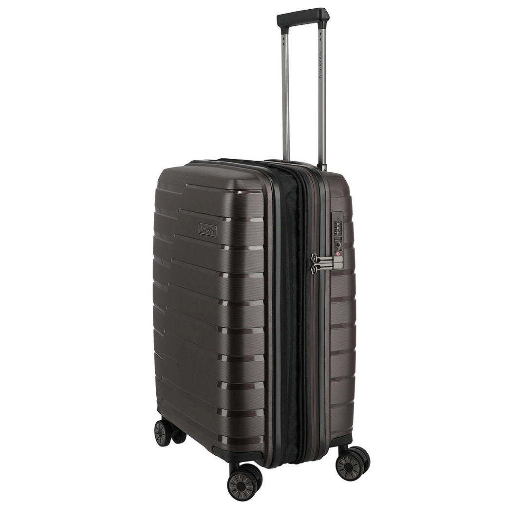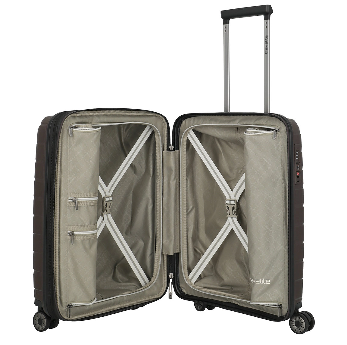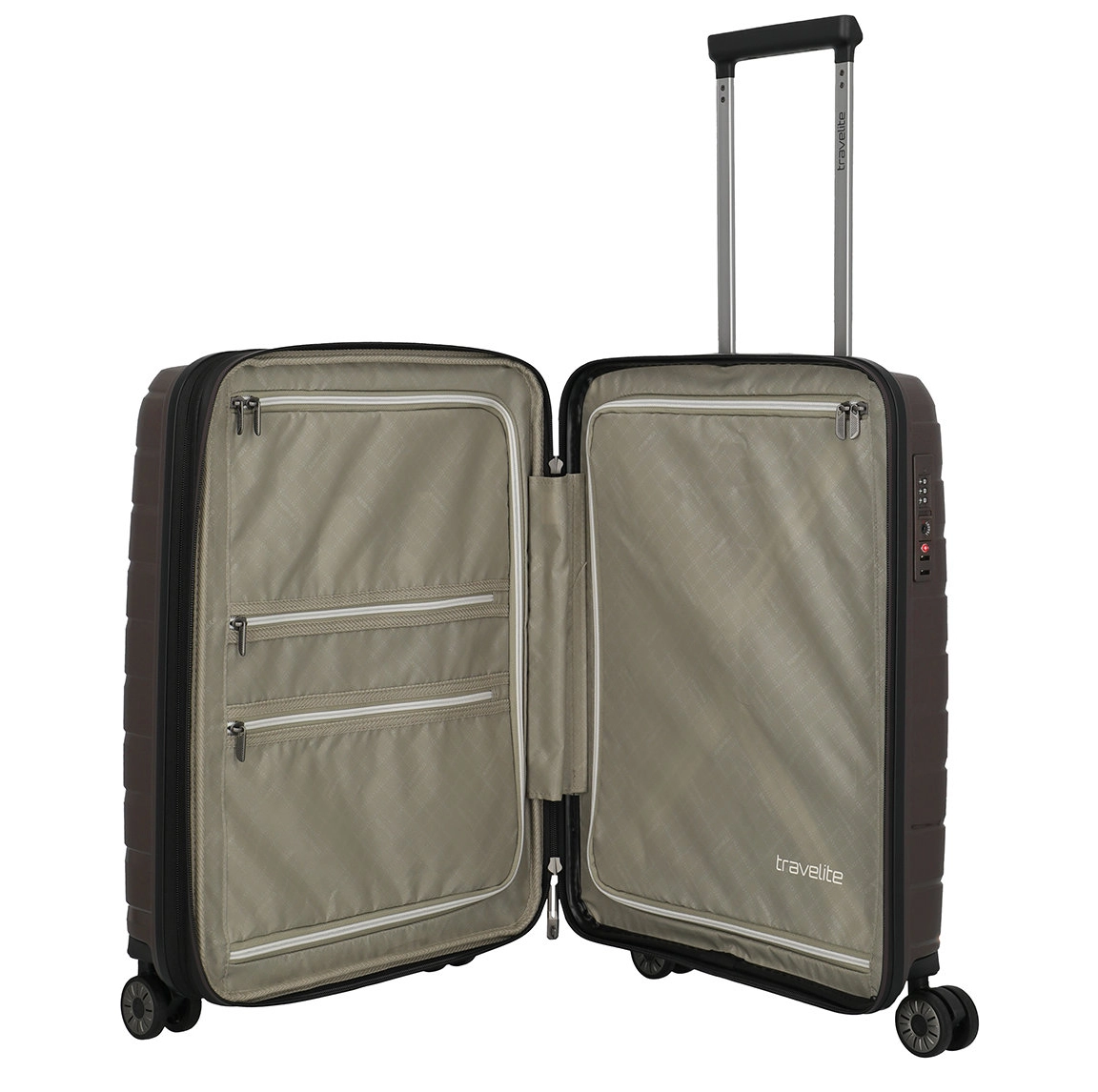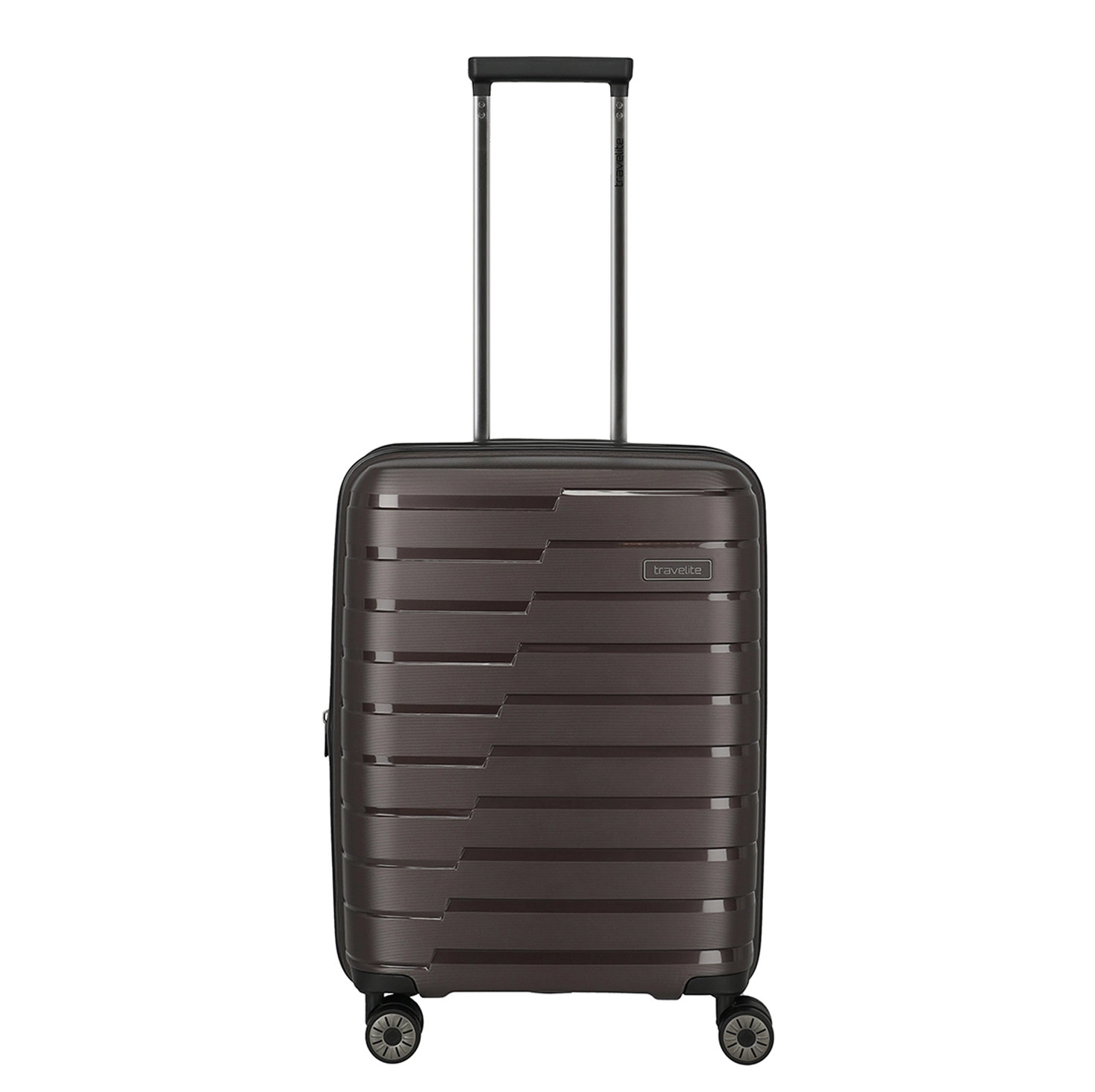 Handbagage maat koffer uit de Air Base serie van Travelite. Travelite brengt met de Air Base collectie een moderne serie die zich kenmerkt door het soepele polypropyleen materiaal in drie luxe metallic kleuren. Het interieur is voorzien van een hoogwaardige voering en van elastische inpakriemen en heeft twee verdelers waarvan één met ritsvak zodat je al je spullen overzichtelijk en veilig kunt opbergen. Vier dubbele wielen in combinatie met een handige telescopische trekstang zorgen ervoor dat de koffer op elk oppervlak goed loopt. Voor de veiligheid, is de koffer voorzien van een cijferslot met daarin verzonken TSA Lock-functies, mooi verzonken aan de zijkant van de koffer.