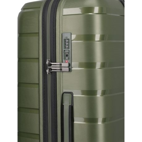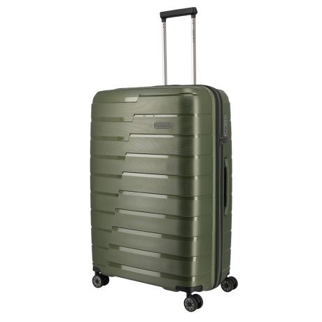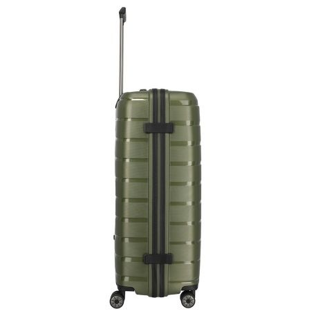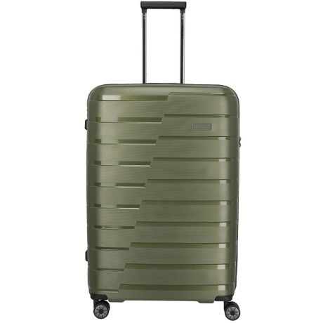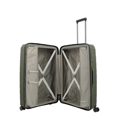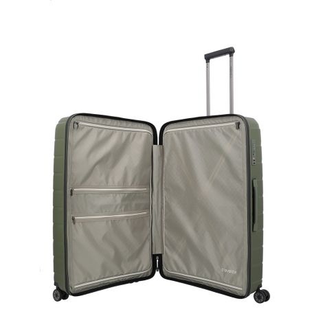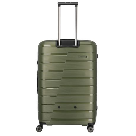 Grote maat koffer uit de Air Base serie van Travelite. Travelite brengt met de Air Base collectie een moderne serie die zich kenmerkt door het soepele polypropyleen materiaal in drie luxe metallic kleuren. Het interieur is voorzien van een hoogwaardige voering en van elastische inpakriemen en heeft twee verdelers waarvan één met ritsvak zodat je al je spullen overzichtelijk en veilig kunt opbergen. Vier dubbele wielen in combinatie met een handige telescopische trekstang zorgen ervoor dat de koffer op elk oppervlak goed loopt. Voor de veiligheid, is de koffer voorzien van een cijferslot met daarin verzonken TSA Lock-functies, mooi verzonken aan de zijkant van de koffer.